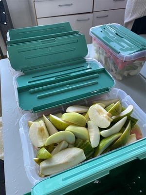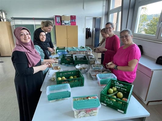 in Bio-Qualität. Hilfsbereite Eltern schälen und schnibbeln an diesen Tagen morgens fleißig die frisch angelieferte Ware für unsere Kinder in mundgerechte Stücke. Heute trafen sich hierzu Eltern